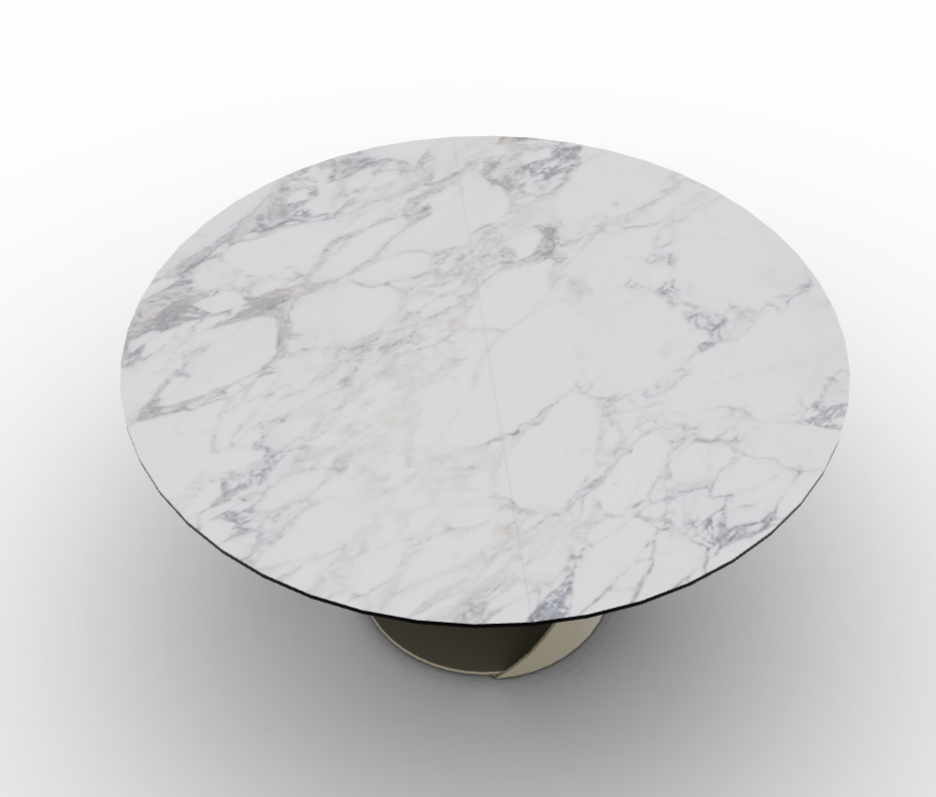 A caratterizzare Cyclone è il basamento centrale ispirato a una rotazione ciclonica, formato da due lastre d'acciaio curvate che cambiano in base al punto di osservazione, dando al tavolo un inedito dinamismo. I sottili piani rotondi, anche con allunghe, sono in ceramica effetto marmo.
