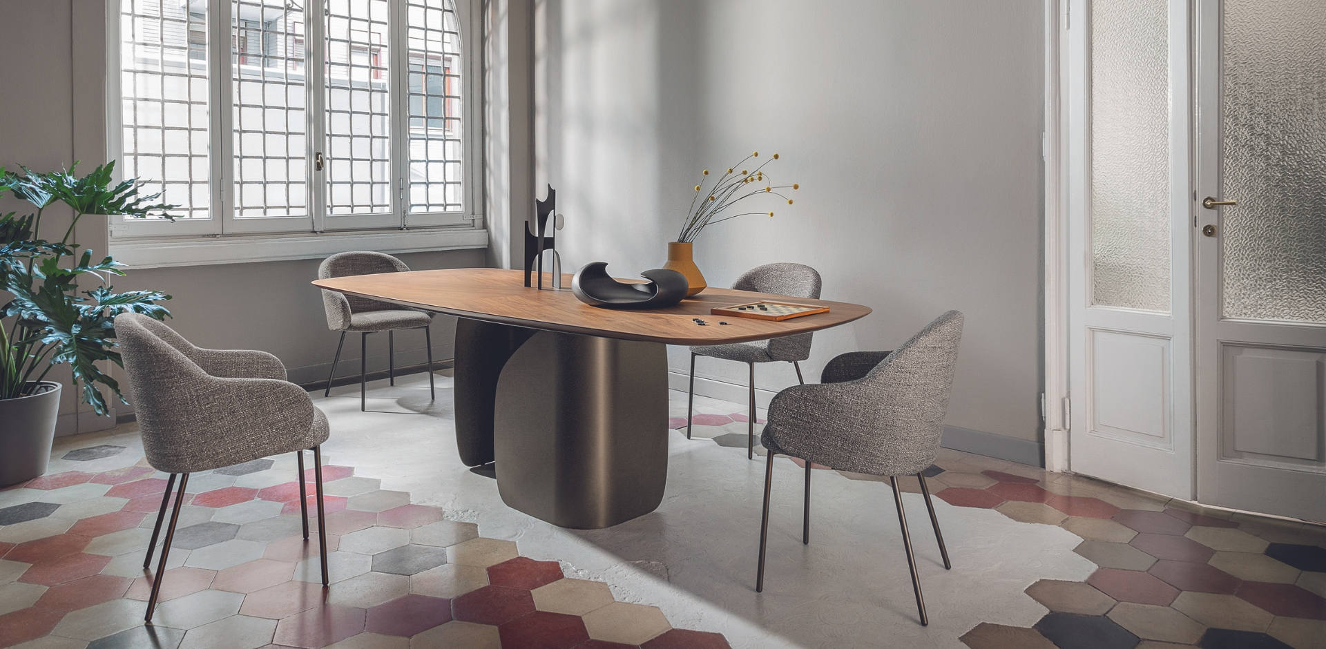 Twins è un tavolo di grande impatto visivo. Merito del basamento, realizzato con due elementi di lamiera curvata e sagomata, che come due ali fanno spiccare visivamente il volo al piano. Numerose le finiture disponibili, che consentono di interpretare il tavolo in modo più classico o più moderno.