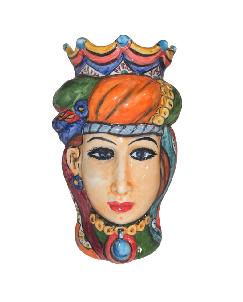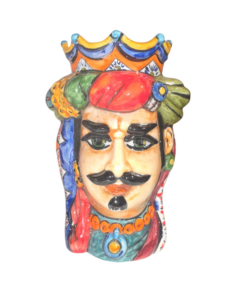 Vaso testa di Moro in ceramica artigianale, modellato e dipinto interamente a mano. Questo pezzo raffigura il volto coloratissimo di un Moro siciliano, coronato e ornato con motivi tipici della tradizione mediterranea: turbante verde, decorazioni arancio e blu, dettagli dorati e gioielli in rilievo. La lavorazione minuziosa e l’esplosione di colori rendono questo vaso un protagonista assoluto di qualsiasi ambiente, simbolo di storia, arte e cultura siciliana. Ideale come oggetto d’arredo di grande impatto e fascino.