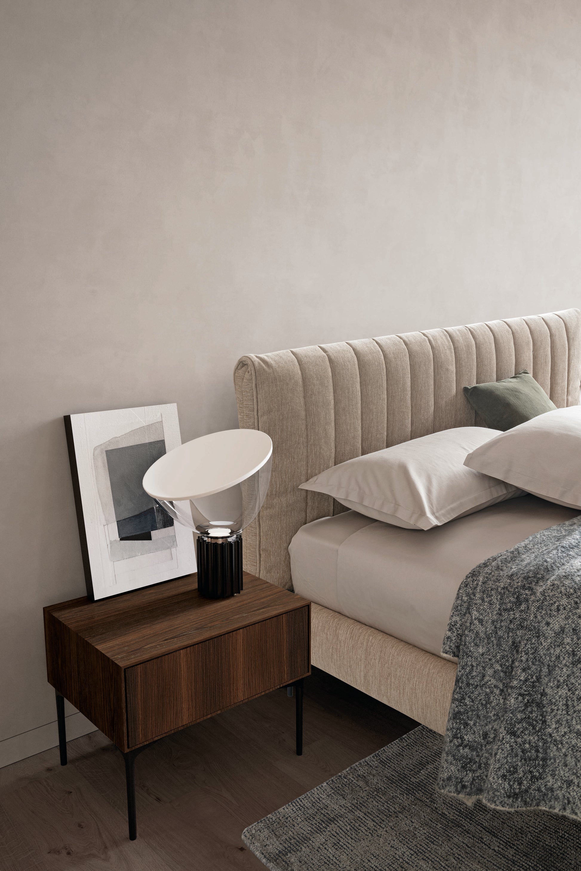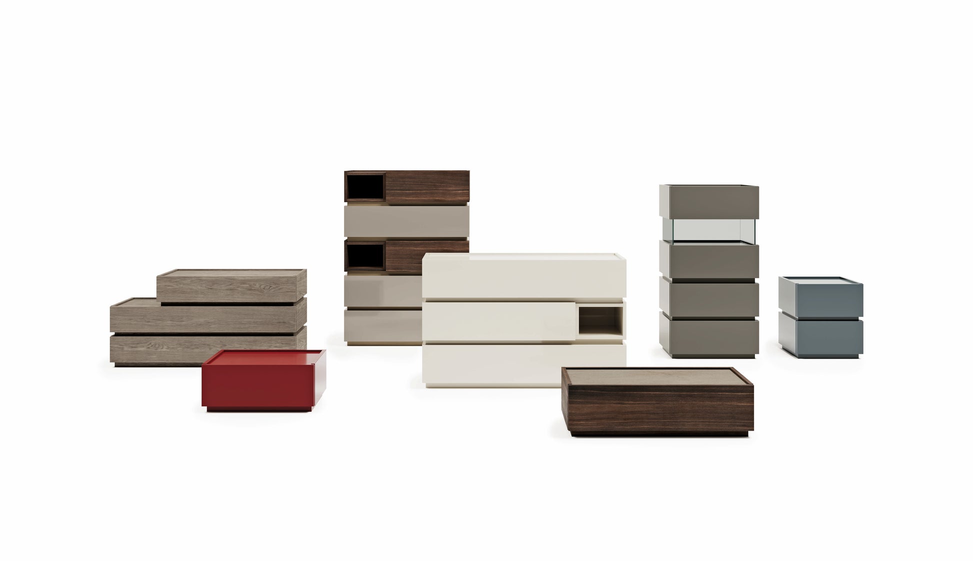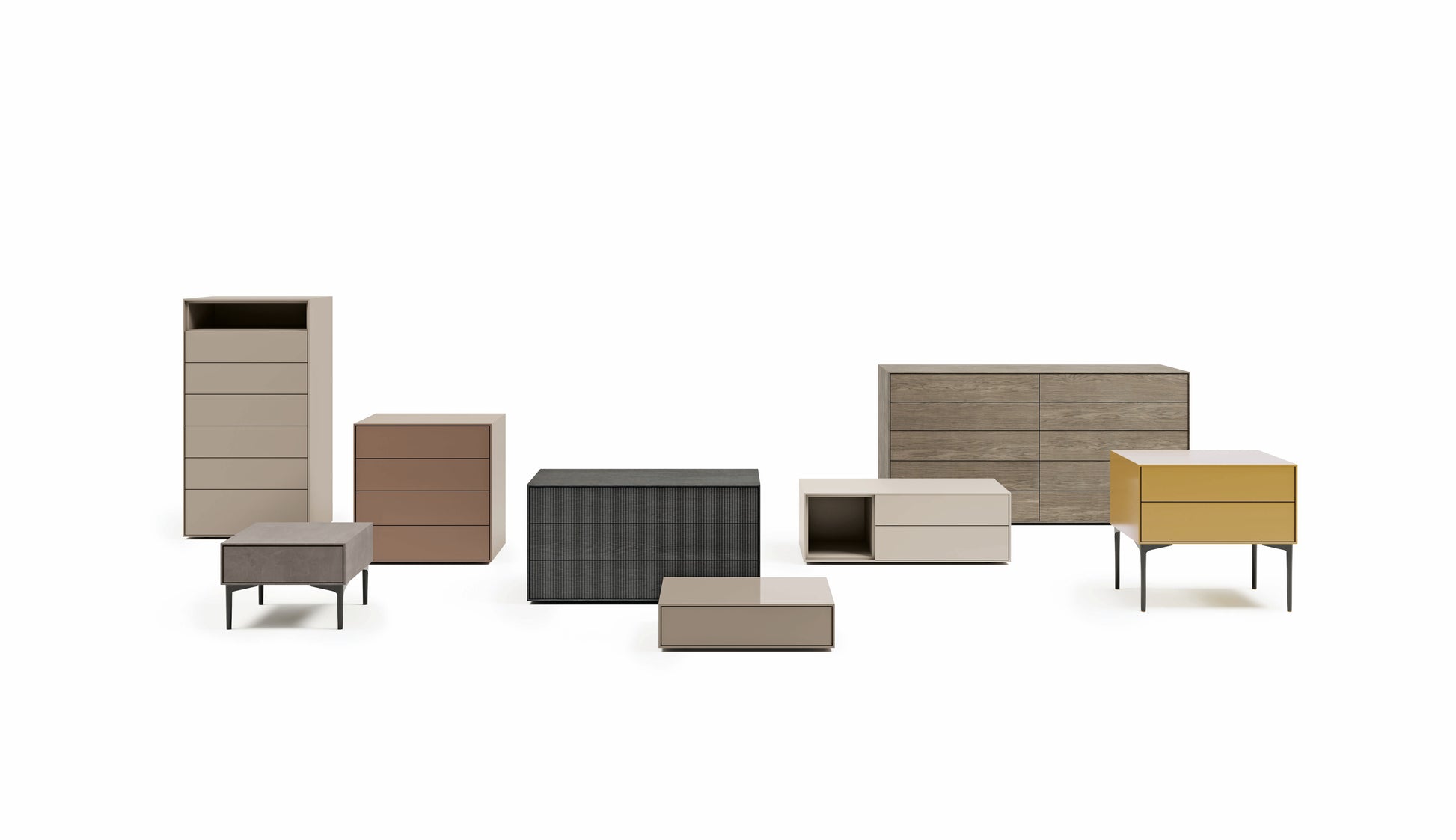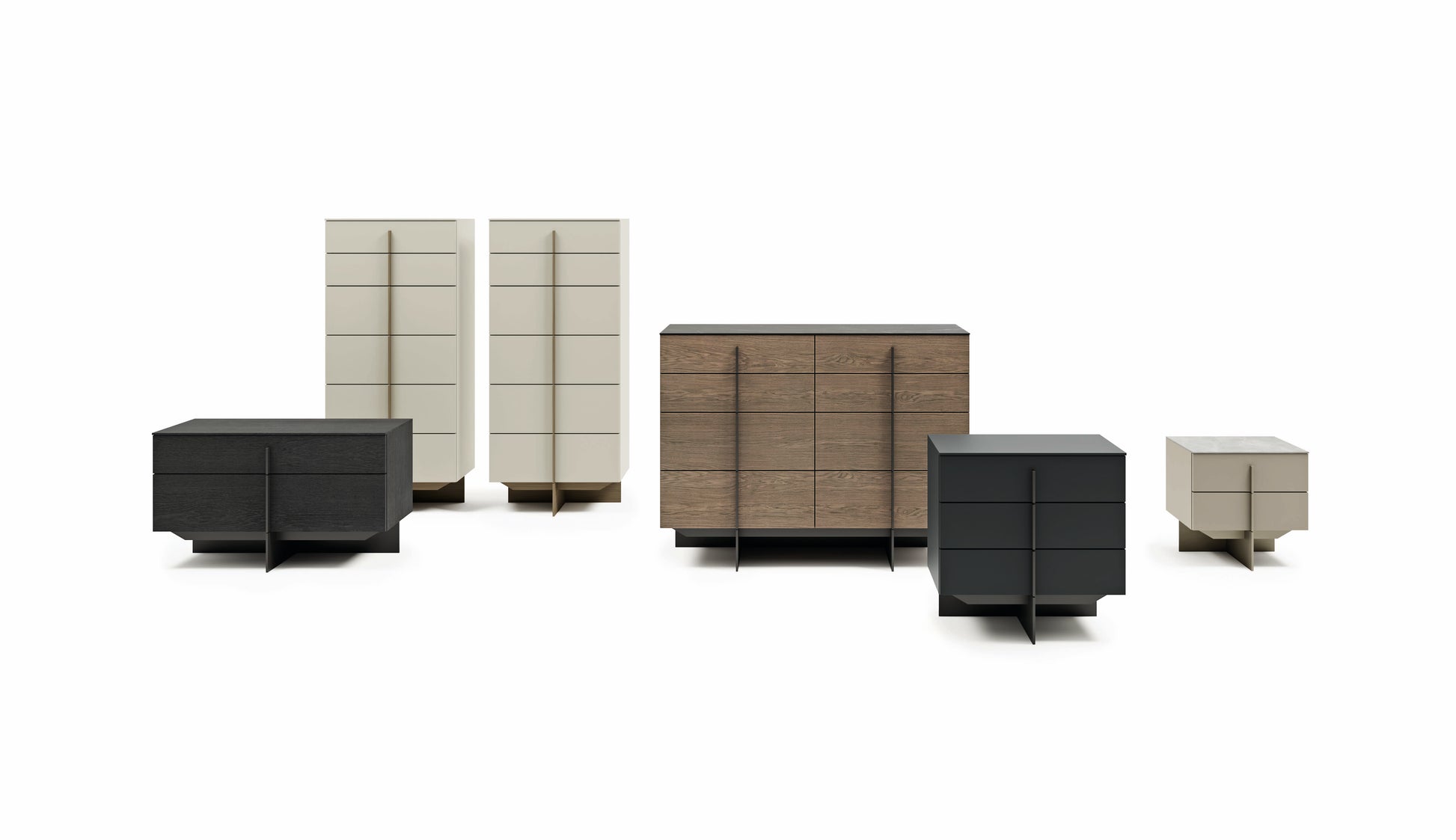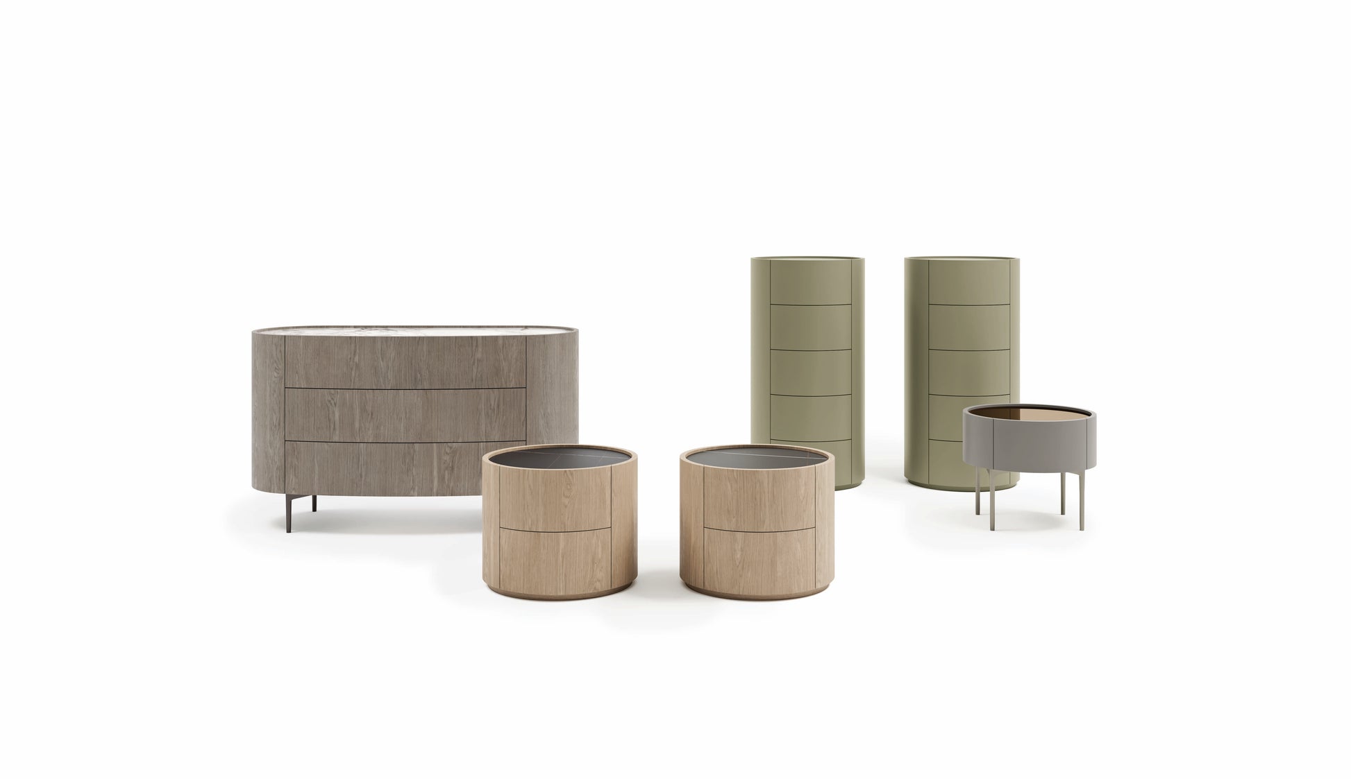 Forme lineari o arrotondate, giochi di volumi, curati accostamenti di materiali valorizzano i comodini, i comò e i settimanali della zona notte.