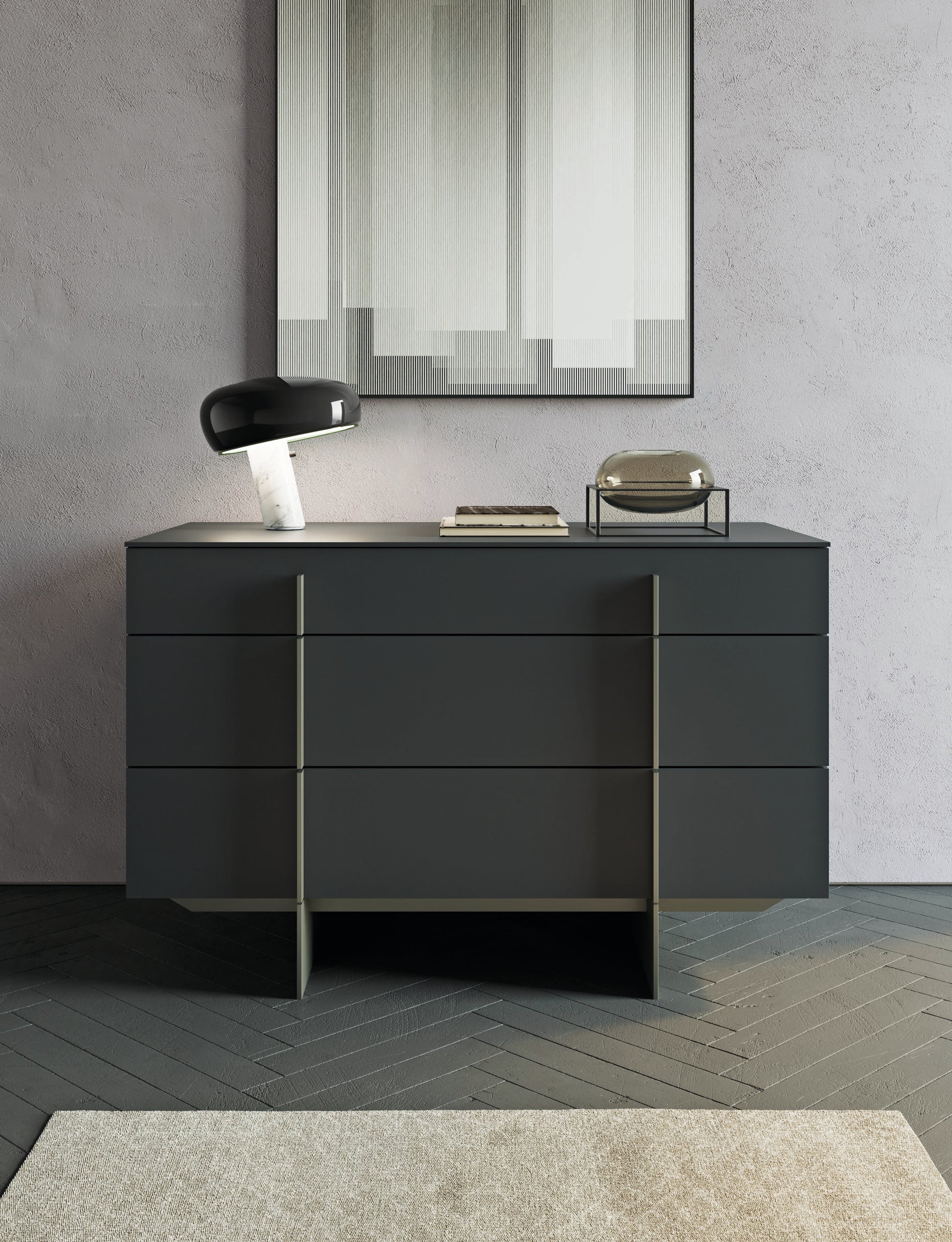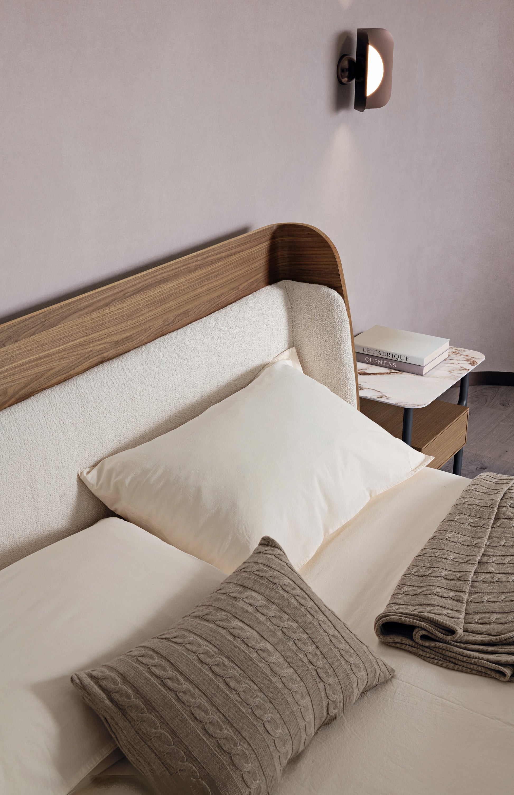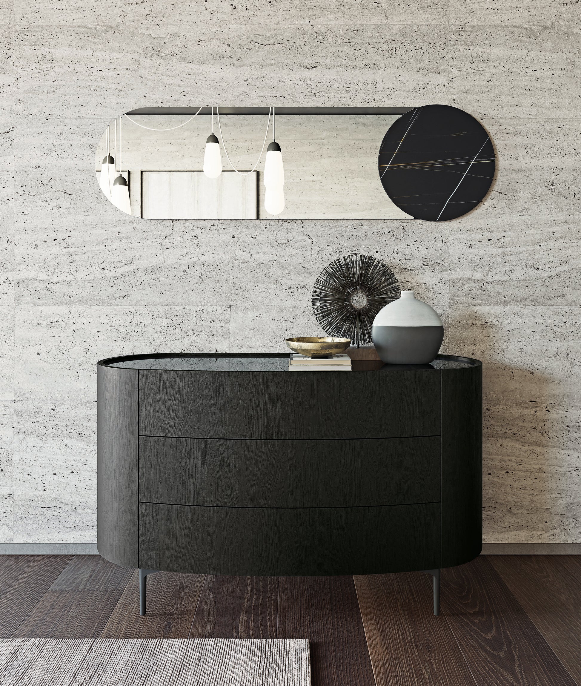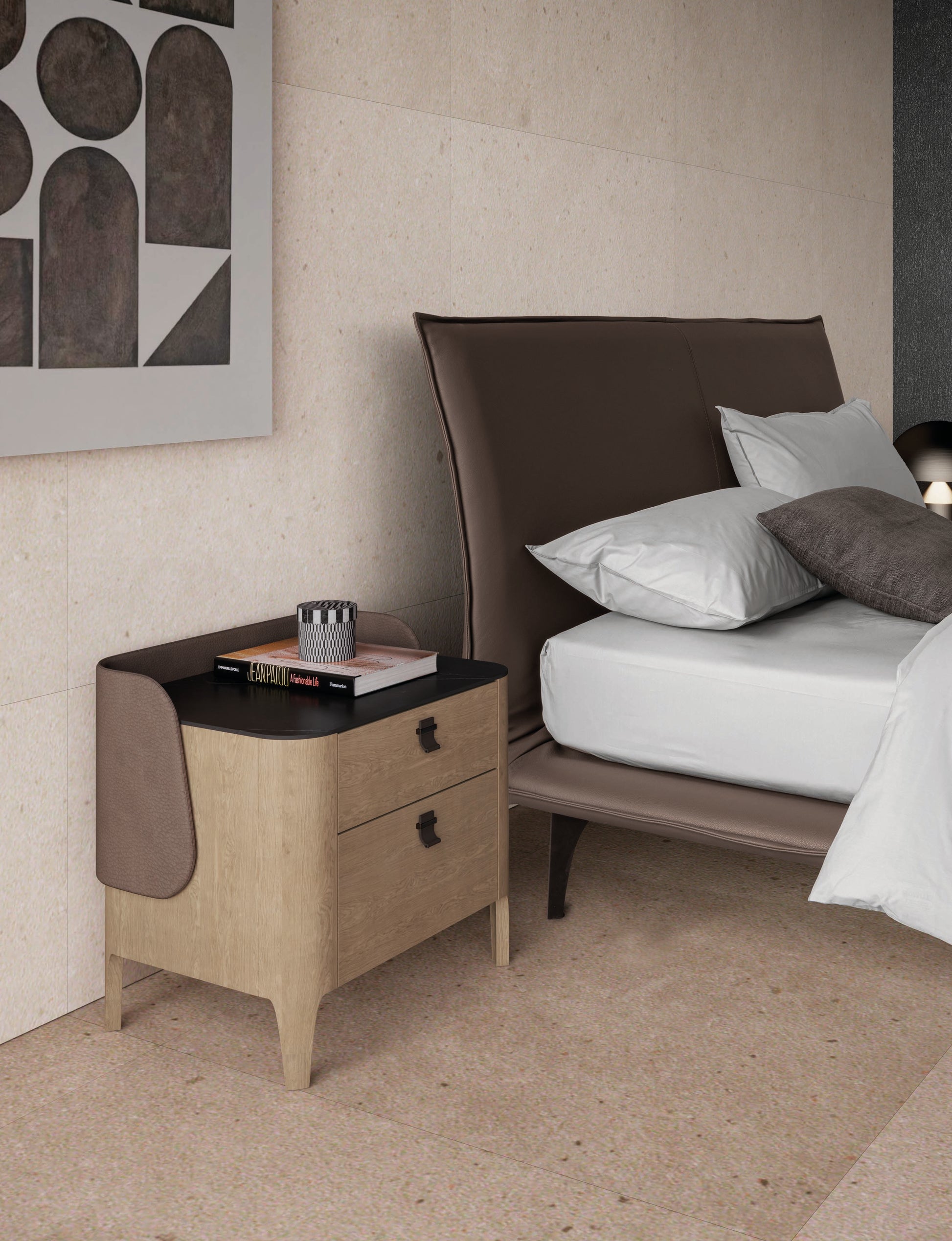 Forme lineari o arrotondate, giochi di volumi, curati accostamenti di materiali valorizzano i comodini, i comò e i settimanali della zona notte.