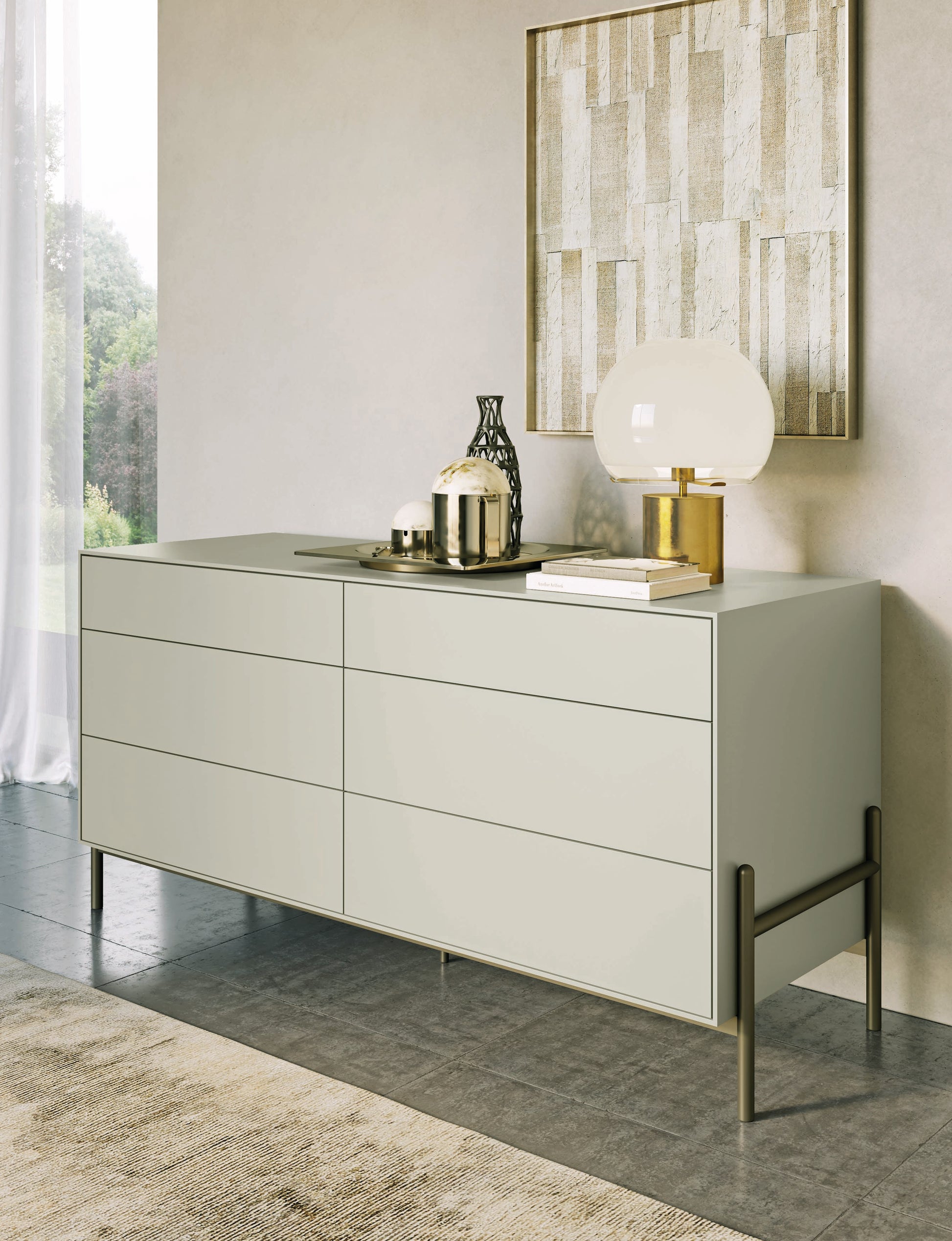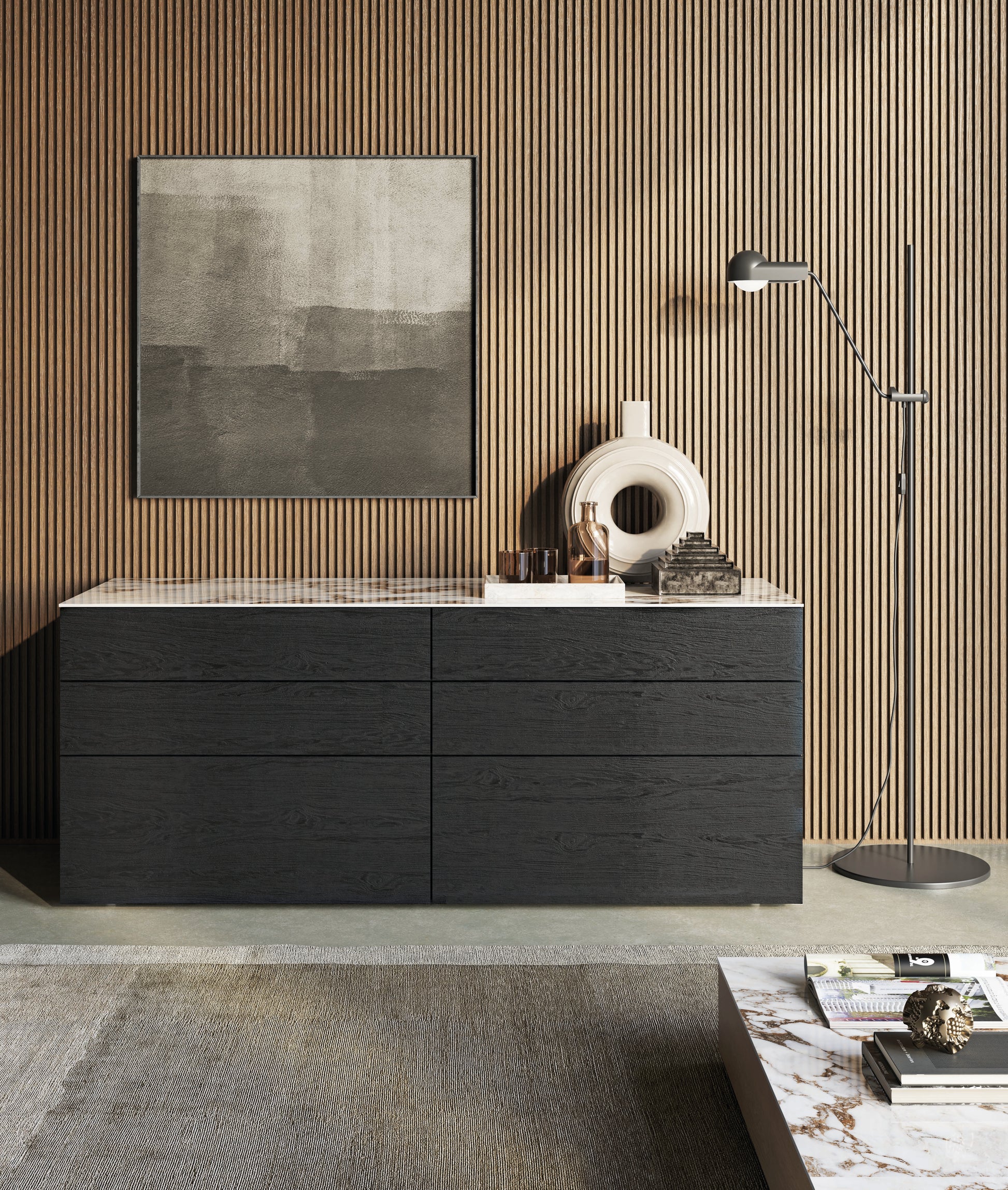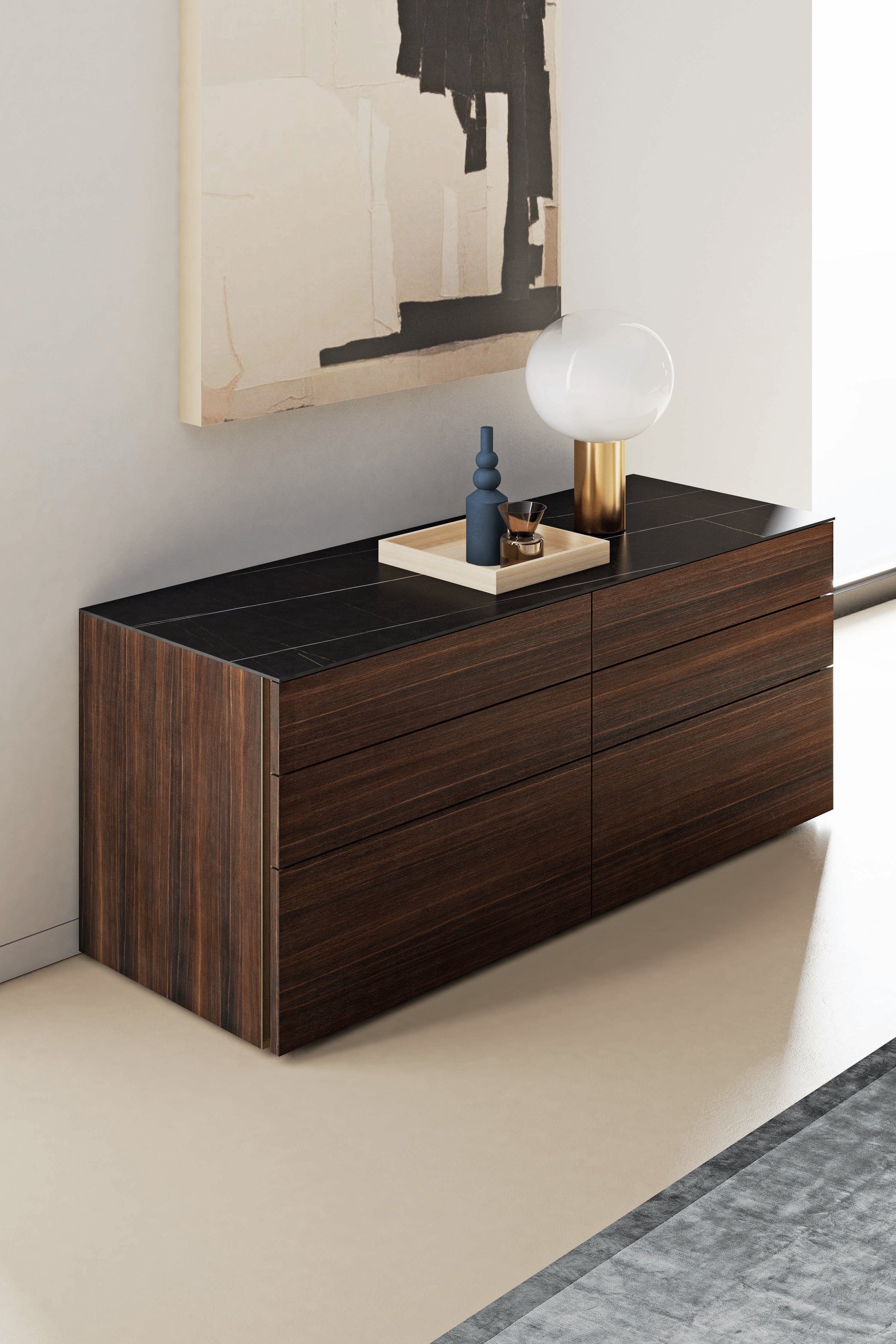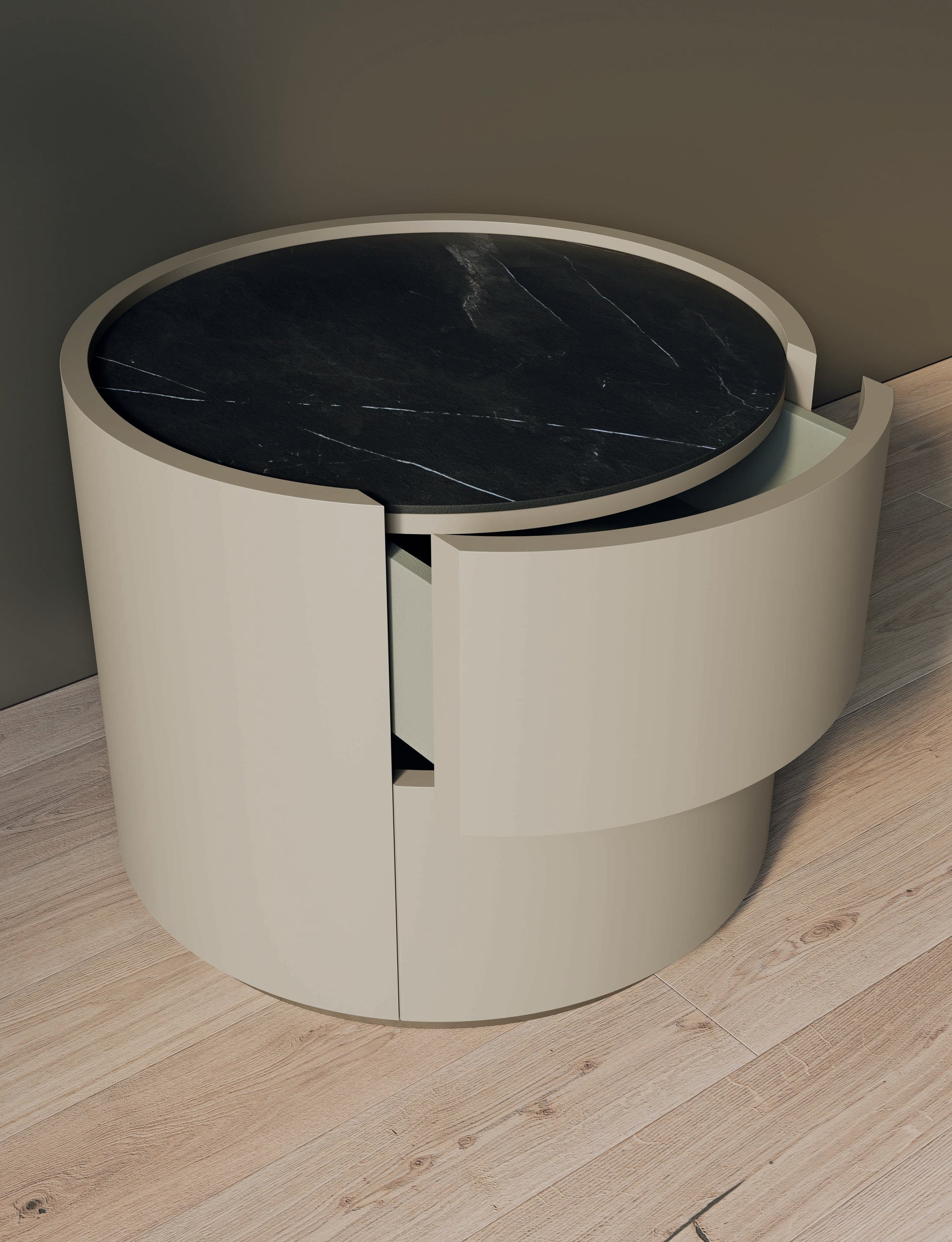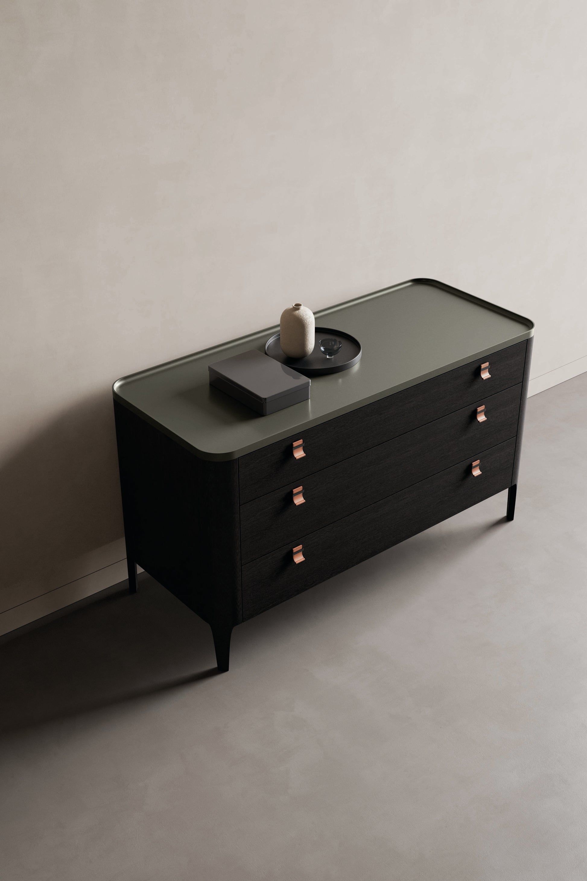 Forme lineari o arrotondate, giochi di volumi, curati accostamenti di materiali valorizzano i comodini, i comò e i settimanali della zona notte.