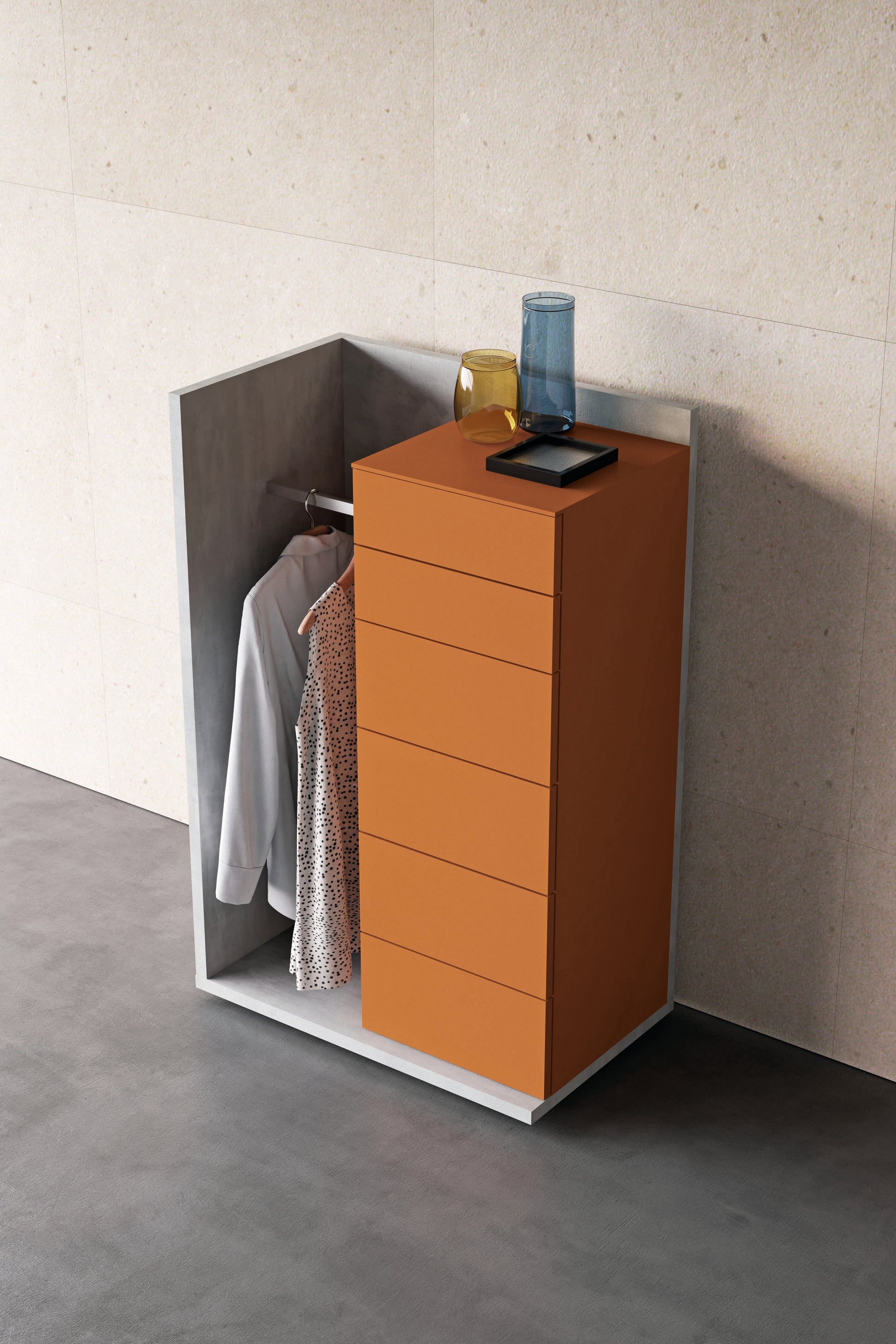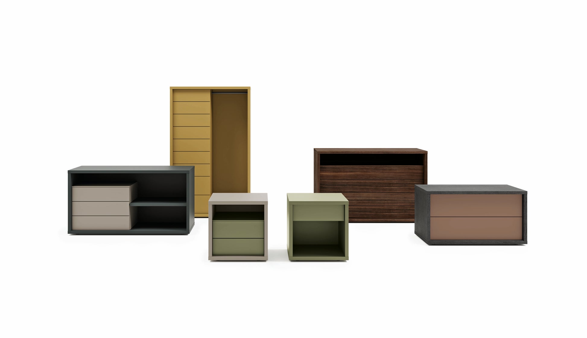 Contenitori notte lineari da organizzare a piacere grazie ai vari moduli disponibili, utilizzabili sospesi o a terra, anche con piedini.
