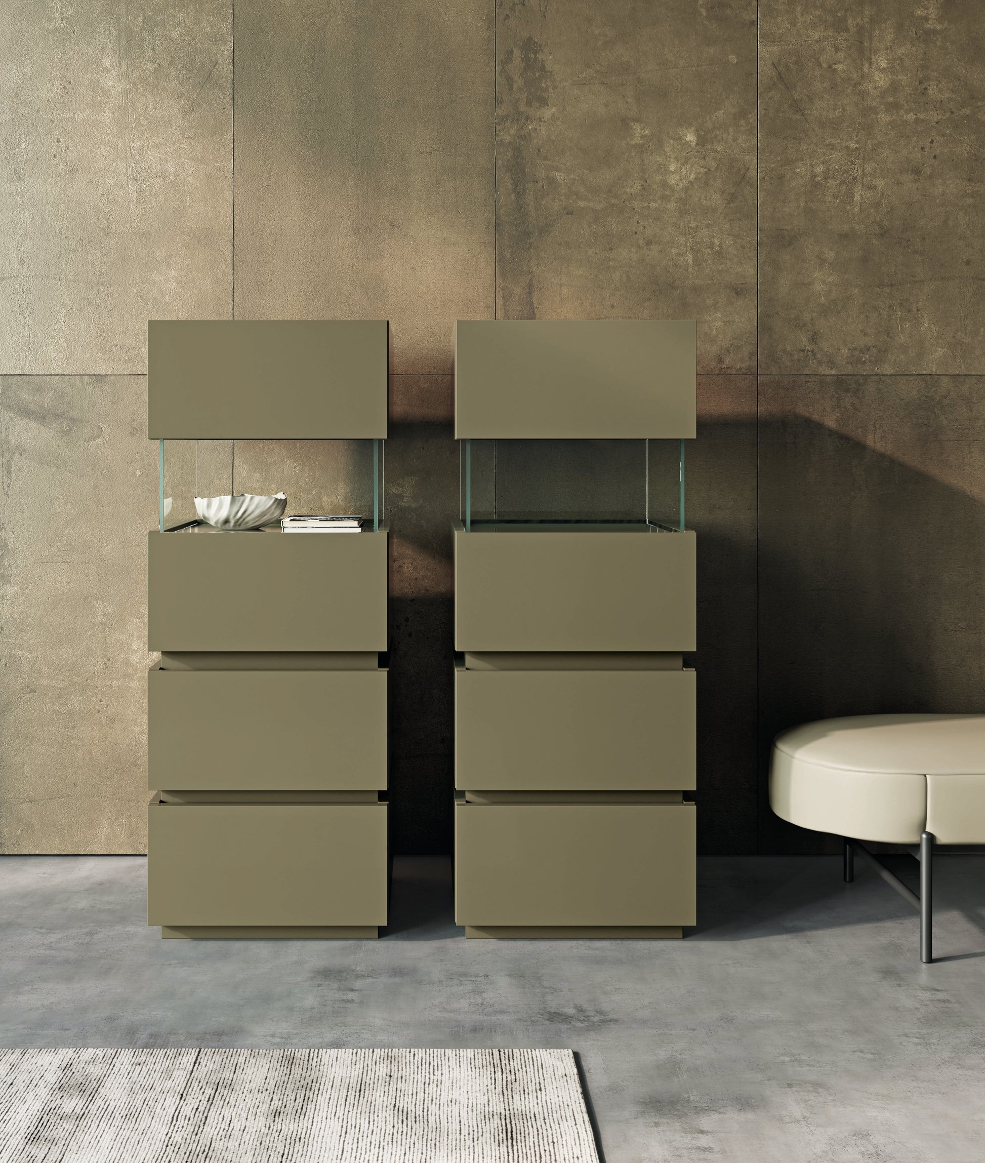 I contenitori notte Slim nella versione con un'intera cornice da configurare in infiniti modi diversi. Finiture laccate, lignee o materiche.