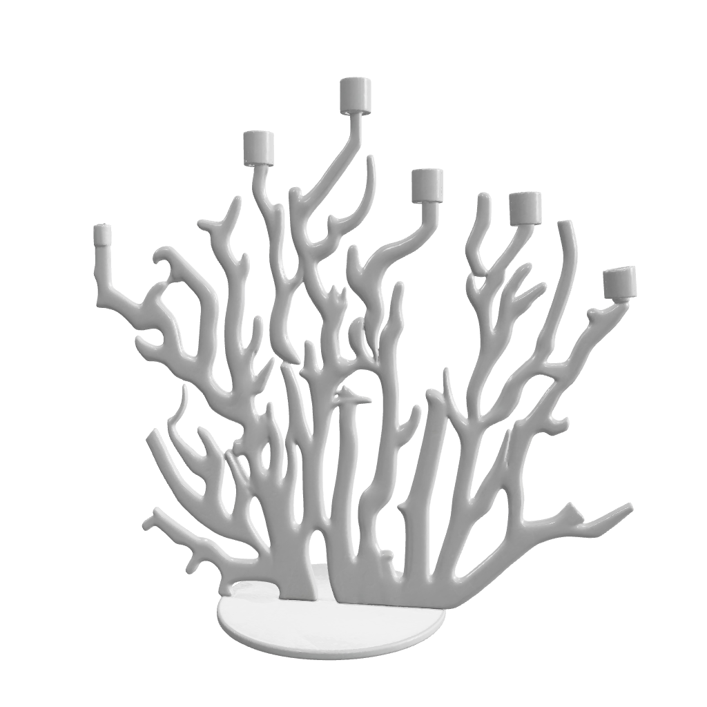 Sette rami di corallo rosso, magicamente sortiti dal mare, formano l’intricato disegno del candelabro di Vittorio Locatelli.Altezza: 46 cm