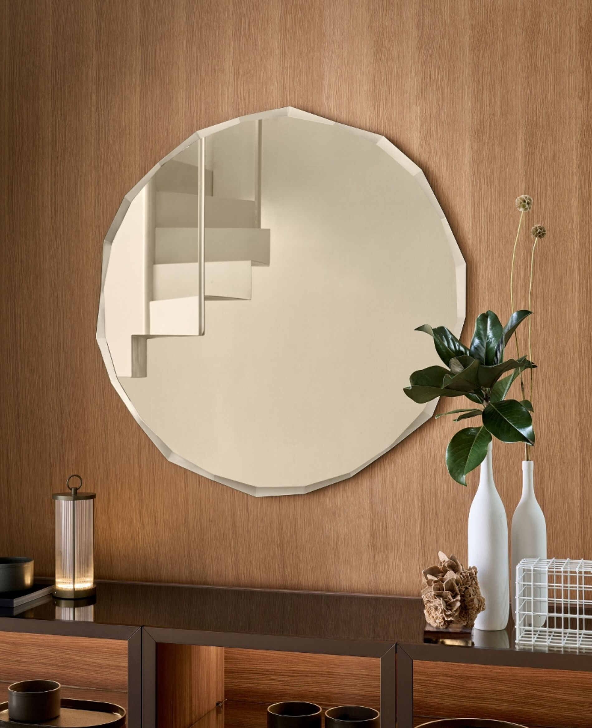 Specchio con cornice perimetrale con bisellatura irregolare. Disponibile in cristallo specchiante o bronzato in diverse misure.