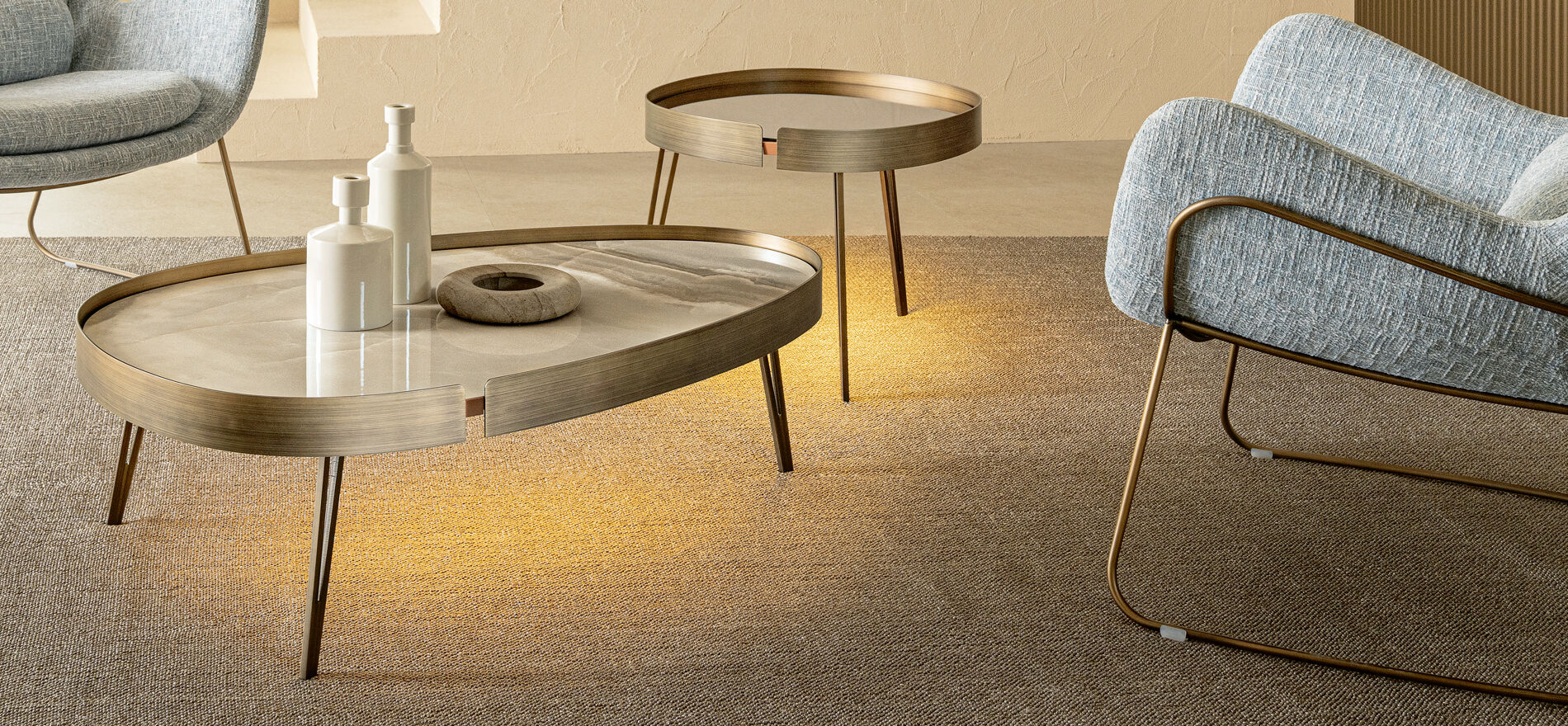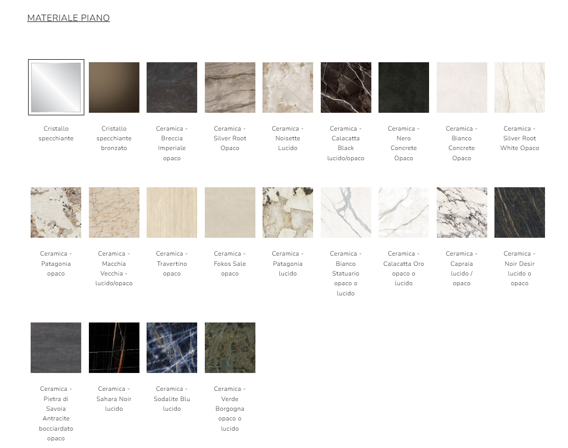 Piani in cristallo o in ceramica dalle forme armoniose, sagome morbide, prive di spigoli, dai dettagli di forte impatto, come la sottile fascia in metallo che avvolge il profilo del piano, o i piedi in metallo, lineari e leggeri.
