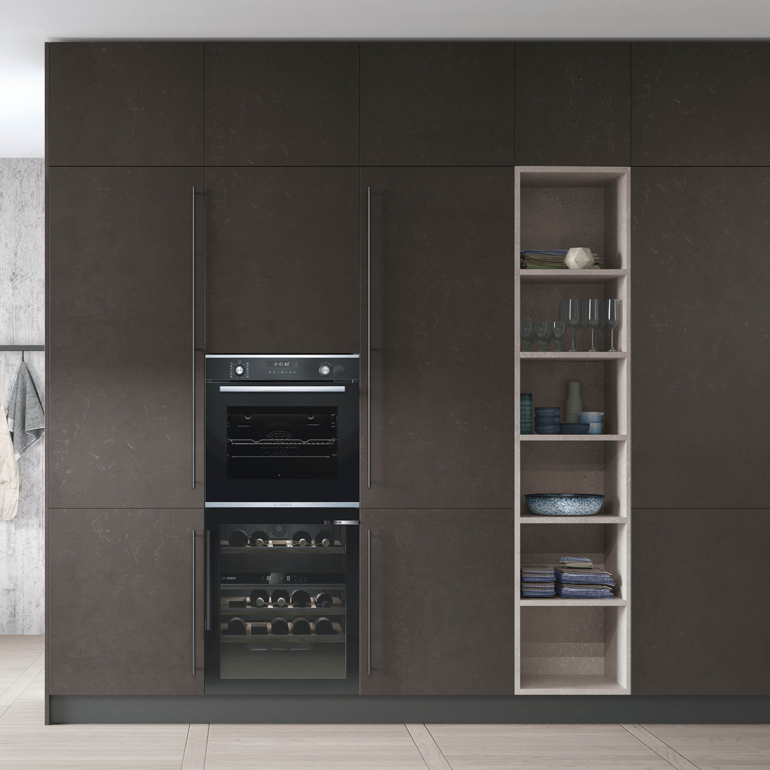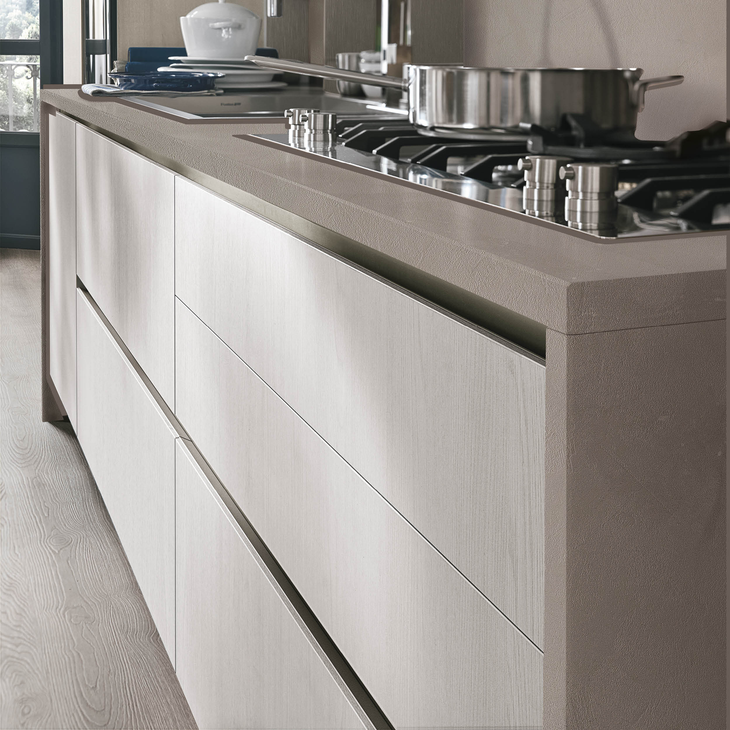 Infinity è progettata con Look System e permette di giocare con alternanze di chiari e scuri, accostamenti di colore ed essenza, cambi di volume e uso sapiente di pieni e vuoti, accogliendo elementi tecnologici che si integrano perfettamente in una cucina dalle infinite soluzioni progettuali.